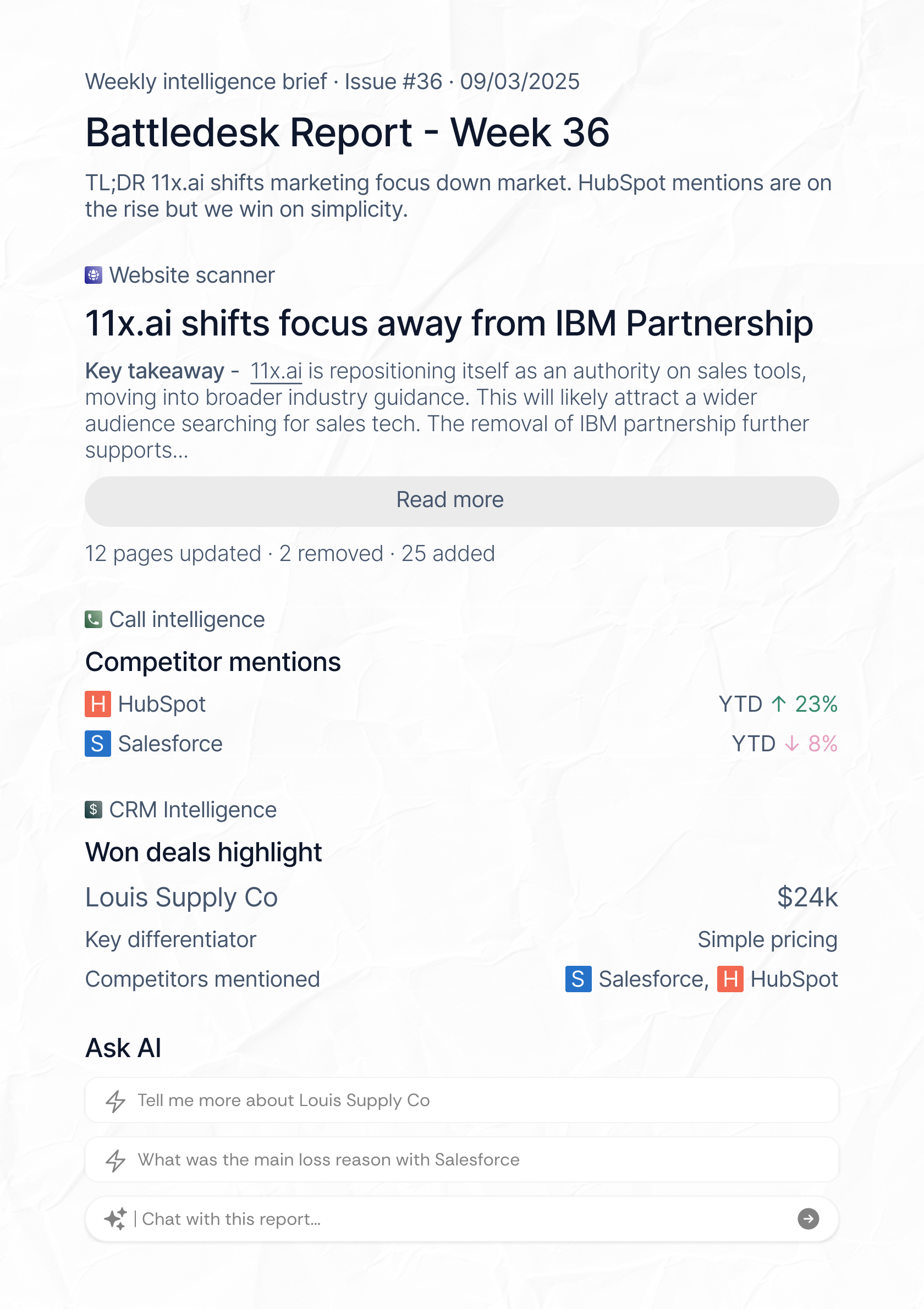 Battledesk has been shaped by feedback from fast growing SaaS and market leaders alike, and refined into a top tier competitive intel agent.